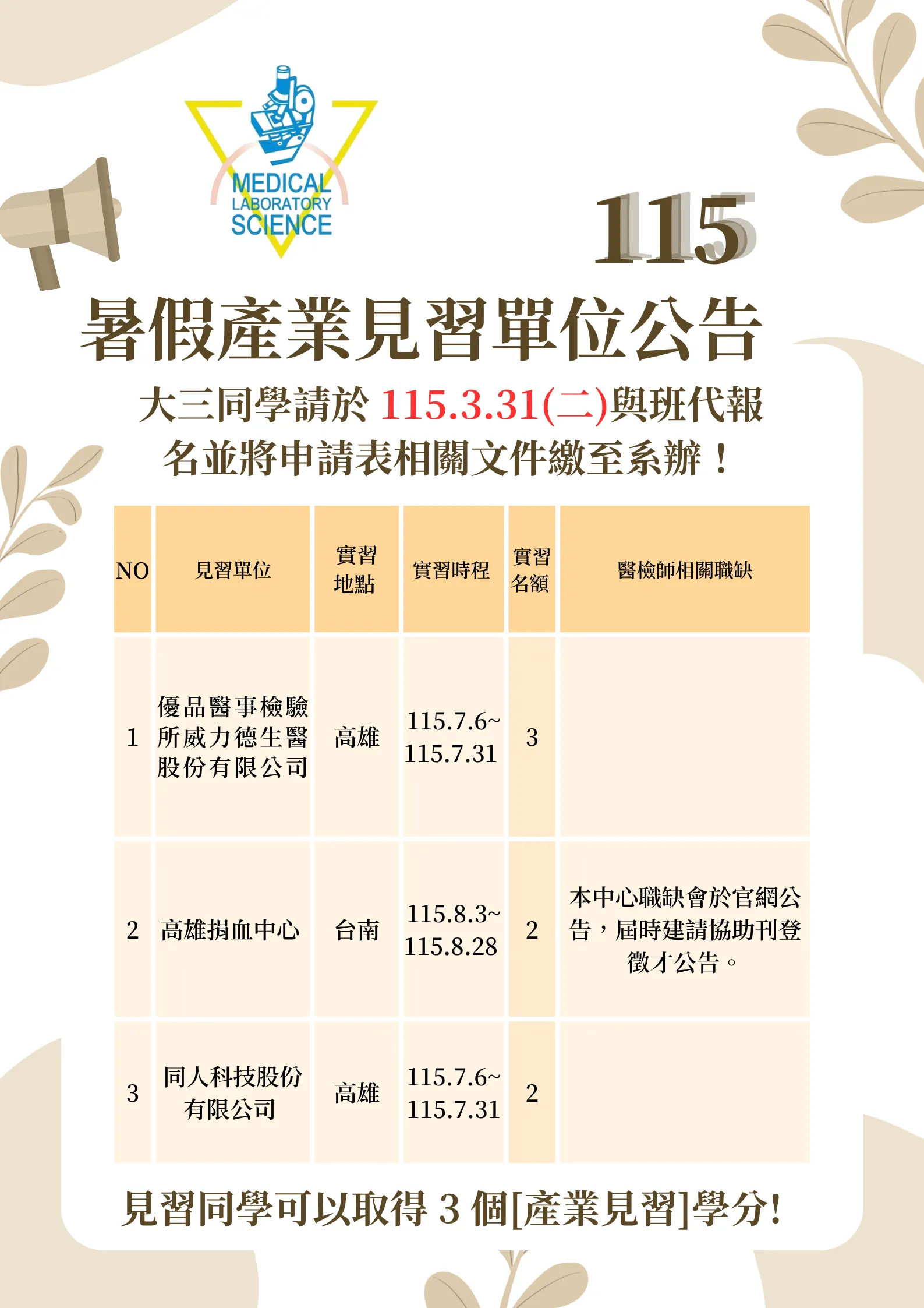 公告與要點 暑假見習單位公告 產業見習手冊 109 學年度學生產業見習手冊 110 學年度學生產業見習手冊 111 學年度學生產業見習手冊 112 學年度學生產業見習手冊 113 學年度學生產業見習手冊 114 學年度學生產業見習手冊 附件 學生校外實習滿意度問卷調查表 校外實(見)習機構滿意度問卷調查表 實習機構評估表(見習) 附加檔案 義守大學醫學檢驗技術學系學生校外見習作業要點 學生校外見習申請表 校外見習家長同意書 學生校外見習合約書(範本) 學生校外見習成績考核表 見習心得報告格式及內容相關規定